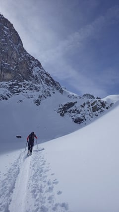 Zügig stiegen wir unter der mächtigen Felswand des Piz Polaschin die Gianda Polaschin in die Lücke auf. Hier befand sich die heutige "Schlüsselstelle" in punkto Gefahrenpotential. Denn dieser Nordhang war für die Lawinensituation "erheblich" und nicht zu unterschätzen. Doch die Vorortbesichtigung und Einschätzung liess ein Weitergehen zu.