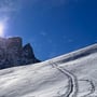 Das Wetter war einmal mehr kaum zu übertreffen. Die Sonne schien bereits den Gipfel des Piz Mez an. Auch wir schritten wenig später im Licht der immer höher steigenden Sonne. Der Berg war für Skitouren wirklich ideal. Nie zu steil und der riesige Buckel bietet unzählige Abfahrtsmöglichkeiten.
