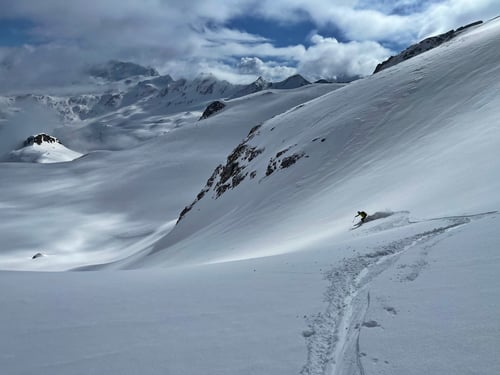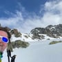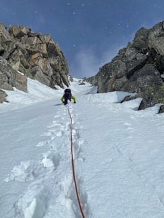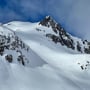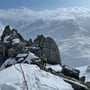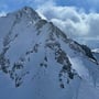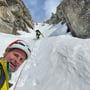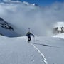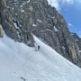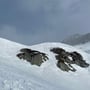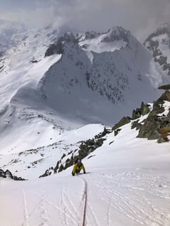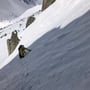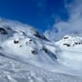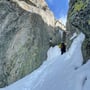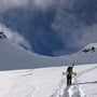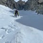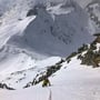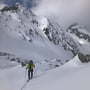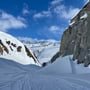 Doch nach einer kurzen Pause, wo wir die Felle abnahmen und uns für das Bergsteigen bereitmachten, stiegen wir voller Überzeugung ins "falsche" Couloir ein. Denn, auf etwa der halben Strecke bis zum Grat, versperrte uns ein Steinblock den Weg. Nach einigem Rumprobieren diesen zu umklettern, kehrten wir aufgrund mangelnder Sicherungsmöglichkeiten wieder hinunter.