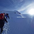 Bald schlossen weitere Tourengänger auf und halfen beim Spuren mit. Immer wieder wurde die Spitze durch neue Beinkraft abgelöst und so ein stetiges Weiterkommen erreicht. Ich selber empfand das Spuren als extrem anstrengend. Bereits nach ein paar Metern brannten meine Oberschenkel und ich war sehr froh, dass Sandro den Löwenanteil bewältigte. War es doch meine erste richtige Skitour diesen Winter… obwohl das vermutlich bei allen Beteiligten mehr oder weniger der Fall war.