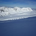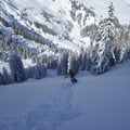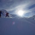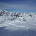 Dann folgte das Schönste einer Skitour - die Abfahrt. Vor uns lagen rund 1200 Höhenmeter Skifahrt. Doch so einfach war ein Vorwärtskommen in diesem vielen neuen Schnee nicht. War er doch so pulverig, dass man bei jeder Kurve knietief einsackte. Bei den steileren Stellen fungierte man dabei oft als Schneepflug. Spass machte es allemal.