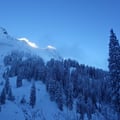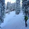 Als wir um 07:00 Uhr starteten war es immer noch finster. Wir folgten der Pragelstrasse nach Eigeli. Seit Samstag hatte es etwa 50 cm geschneit und wir mussten ganz schön „Spuren“. Bald wurden wir eingeholt und ein anderes Skitourenduo übernahm die Arbeit.