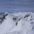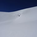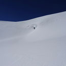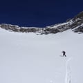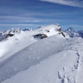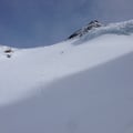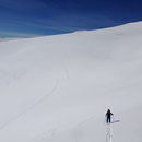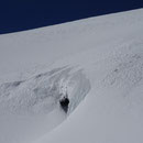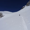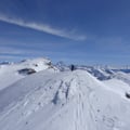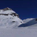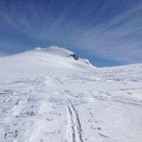 Nun ging es steiler aufwärts. Vorbei an Lämmerenhorn schleichten wir anschliessend im Zick-Zack dem Wildstrubelgrat entgegen. Der Alkohol von gestern machte sich allmählich bemerkbar. Doch immerhin, wir standen nach guten drei Stunden auf dem Punkt 3195 östlich des Mittelgipfels. Weiter ging es zum Grossstrubel, dem eigentlichen Gipfel. Nochmals ein wenig mit den Fellen runterfahren, dann 150 Meter Gegenanstieg und es war geschafft. Und wir auch! Mehr wäre heute nach den 1200 Höhenmetern wohl nicht mehr gegangen.