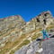 Das erste Gipfelziel war der Cima dell‘Uomo, den wir mit finalem Kraxeln über die Südostseite erklommen. Laut Kartenmaterial und Markierung handelt es sich um einen rotweissen Wanderweg; doch wir beide schätzten diesen Aufstieg als blauweissen Pfad ein. Für den Schlussaufstieg muss auch mal kurz im zweiten Grad geklettert werden.