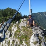 Der Falkenstein besteht aus zwei Hauptgipfeln. Ich nahm den Aufstieg von Nordwesten vor. Durch nasses Dickicht des gestrigen Niederschlages ging es stetig hoch den Felsen entgegen. Bald fand ich die mit einem kleinen Steinmannli versehene Abzweigung hinauf auf den Steig für die Besteigung. Ab jetzt war immer wieder Kraxeln angesagt (II). Die gefährlichen Stellen waren mit Stahlseilen gesichert, was mir bei dem noch feuchten Gelände zur Hilfe kam.