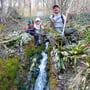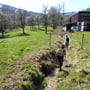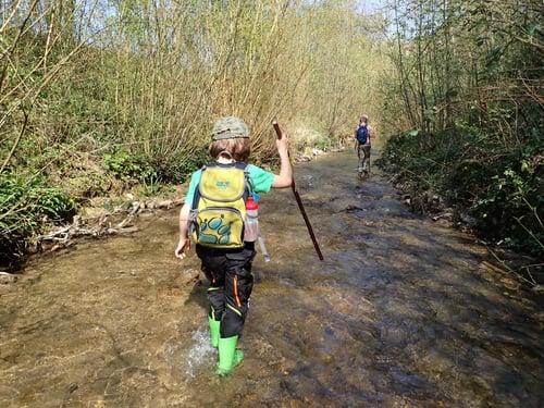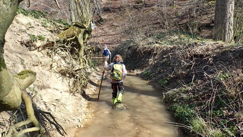 Wir, Emilia, Luca und Olli, starten auf zum Abenteuer Orisbach. Die erste Etappe sollte nicht bei einer der Quellen beginnen, sondern wir wollten gleich hinein in den Bach steigen und losmarschieren. Unser heutiger Startort war somit der Ortsausgang von Büren (Pt. 431), wo wir mit selbst gesuchten Holzwanderstöcken, Gummistiefeln und robusten Klamotten ins Wasser traten.