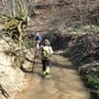 Lucas Gummistiefel waren noch nass. Wir fuhren zum gestrigen Etappen-Endpunkt bei der Verzweigung der Liestalerstrasse Büren/Lupsingen, parkten das Auto und holten unsere Wanderstöcke aus dem Versteck. Gleich hinter dem Tunnelende stiegen wir ins Bachbett und ins kalte Wasser.
