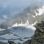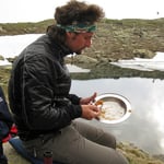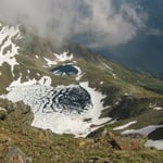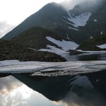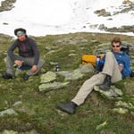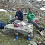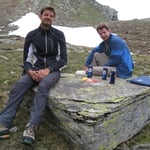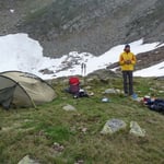 Unsere Route folgte stets dem höchsten Punkt bis wir schliesslich nach dem Passo Comasnengo den Pécianett (2764m) erreichten, von wo wir unser geplantes Nachtlager an den Laghi Chièra bereits erkennen konnten. Doch bis dahin war es noch ein Stückchen. Zuerst gilt es vorsichtig in die Scharte vor dem Pécian herunter zu steigen bevor wir die letzte Kletterei bis zum riesigen Eisengipfelkreuz des Pécian’s (2662m) vornahmen. Hier legten wir erst mal unsere schweren Rucksäcke nieder und planten den Abstieg zu den Laghi Chièra. Diese waren teilweise noch vereist und es lag Schnee am Ufer entlang. Wie es der Zufall wollte, waren wir nicht die einzigen, welche am See biwakierten. Obwohl wir den ganzen Tag keine Menschenseele begegneten, waren wir also am Abend nicht alleine. Doch das störte uns nicht.