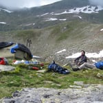 Wir richteten unsere Zelte am Ufer auf 2361m ein und genossen erst mal unser mitgetragenes Bier an der Sonne. Zum Abendessen kochten wir die schon fast obligaten Spaghetti mit Tomatensauce, Zwiebeln und Knoblauch. Dazu genossen wir einen ebenfalls mitgeschleppten guten Rotwein. Mit der dahinschwindenden Sonne wurde es frischer. Bald hatten wir alle mitgenommenen Kleidungsstücke angezogen und genossen einen Schluck Rum aus dem silbernen Flachmann als Bettmümpfeli.