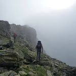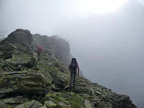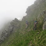 Die Nacht war angenehm mild. Unsere Schlafsäcke fast zu warm, um im Zelt zu übernachten. Um 07:00 Uhr kochten wir Wasser für Kaffee und Tee. Die Sonne erreichte unseren Biwakplatz noch nicht und riesige Nebelschwarten zogen an uns vorbei. Einen Grund vorwärts zu machen und den zweiten Teil der Gratwanderung in Angriff zu nehmen.