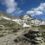 Bei Pt. 2633 verliessen wir den Weg in westliche Richtung und folgten fortan der 2’600er-Höhenlinie in Richtung Südwestflanke des Hohhorengergmassivs über ausgedehnte Firnfelder. Dabei steuerten wir den plattigen, flacheren Vorbau des Hohhoren-Südgipfels an. Bald erkannten wir die schmale Schutt- und Grasrinne, wodurch der Aufstieg auf den Bergrücken erfolgte. Einige Steinmänner wiesen dabei den Weg.