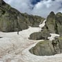 Nach einer kurzen Rast am Mittelgipfel kehrten wir auf der Aufstiegsroute den Grat zurück und das Couloir wieder hinab. Mit dem Pickel fest in der Hand, schritten wir dann über das teilweise schneebedeckte Schrofengelände hinunter zum Remersee, wo wir südlich davon wieder auf den Wanderweg des Nägelisgrätli trafen.