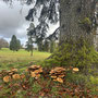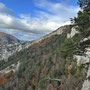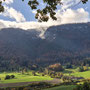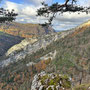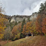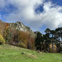 Um 09:30 Uhr, schritten wir schliesslich los und wanderten unterhalb des Forêt du Droit in östliche Richtung. Nach einem kurzen Regenguss öffnete sich die Wolkendecke und die Bäume der Mischwälder gaben im Sonnenschein ihre leuchtenden Rot- und Goldtöne zum Besten. Da und dort zogen noch schwere Nebelschwarten über die Kämme, was der Juralandschaft eine fast geheimnisvolle Stimmung verlieh.