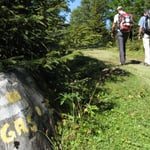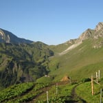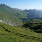 Strahlender Sonnenschein huschte durch das Klappfenster unseres Matratzenlagers. Obwohl heute die strengste Etappe anstand, gab es das Frühstück erst um 08:00 Uhr. Eine Stunde später marschierten wir los. Den Col de Coux und somit die französische Grenze erreichten wir schnell. Hier stiegen wir erst mal 500 Höhenmeter im herrlichen Tannenwald ab. In der Hütte Col de la Golèse (1662m) gab es etwas zu trinken. Dann stand der lange aber einfache Aufstieg zum Tête de Bostan 2406m an. Hier machten wir eine Mittagspause und verpflegten uns mit Lunch aus dem Rucksack. Nun folgte der schwierigste Teil der Tour, der Aufstieg zum Pas au Taureau 2550m neben dem Pointe de la Golette (2638m).