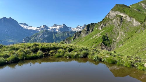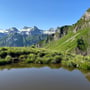 Doch der Weg entlang den Bergseen und Hochmooren hinauf zum Hinter Jochli war sehr abwechslungsreich und liess die Anstrengung ein wenig vergessen. Als wir den Grat und den Passübergang des Hinter Jochli auf 2'105m erreichten, hatten wir wiederum einen spektakulären Blick auf den Vierwaldstättersee. Nun folgte der Abstieg auf der Nordseite durch eine grosse Geröllflanke, auf welcher im Winter die Skipiste verlief.