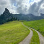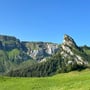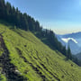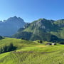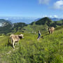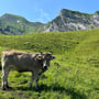 Der Abstieg nach Tannibüel ging schnell vonstatten. Vorbei an interessiert starrenden Kuhherden, über deren Fladen und zwischen blühenden Alpweiden, passierten wir bald die Sessellifttalstation, ehe wir im Berggasthaus Tannibüel zu einer kleinen Erfrischung einkehrten.
