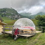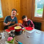 Als wir uns um 19:00 Uhr ins nahgelegene Alpstübli zum Abendessen aufmachten, begaben sich die Hühner des Hofes bereits zum Schlafen in ihren Stall. Die Kühe auf der Weide genossen die letzten Sonnenstrahlen und Luca und ich ein feines Käsefondue in der gemütlichen Gaststube bei Cornelia Aschwanden.