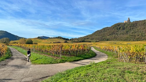 Eine kulturelle und kulinarische Weitwanderung entlang den Weinfeldern von Molsheim nach Colmar (73 km).