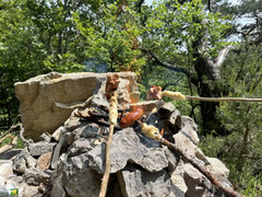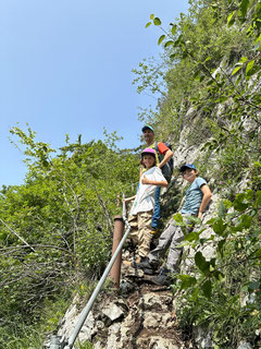 Nach einer kurzen, nicht ausgesetzten Kletterstelle schritten wir gebückt und erwartungsvoll dem Licht auf der anderen Seite entgegen. Am Ausgang befindet sich eine Grotte mit Feuerstelle und dem «Höhlenbuch», wo uns Luca sogleich eintrug. Nach einer kurzen Trinkpause machten wir uns auf zur letzten Etappe, hoch zum Rinderberg.