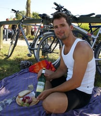 Nach unserer Ankunft gegen 18:00 Uhr haben wir erst einmal unseren Aperó ausgepackt und uns gesonnt! Abendessen (Olli hatte Halbpension gebucht) gab es im Garten gegen 20:00 Uhr. Es wurde Salat, Hackfleischbällchen mit Nudeln und Karotten serviert und schmeckte wirklich lecker! Nachdem wir noch zu einem Gläschen Wein von unseren Tischnachbarn eingeladen wurden, haben Olli und ich noch entschlossen zur Beach Party im Ort zu radeln. Es gab eine Bar und Stände, die Essen und Getränke verkauften und es spielte laute Musik. Das Ambiente war echt schön, da sich das alles auf einer Wiese direkt am Rhein abgespielt hat. Leider war ich ziemlich müde und so blieben wir nur auf einen Caipirinha und radelten dann zurück zum Hof.
