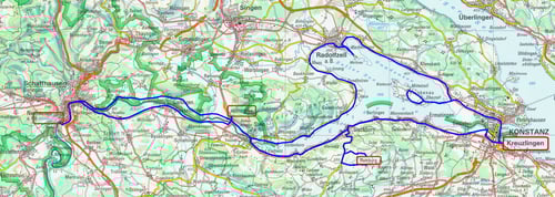 Kompette Route: Kreuzlingen - Steckborn - Homburg - Stein am Rhein - Schaffhausen - Neuhausen / Rheinfall - Hemishofen - Radolfzell - Insel Reichenau - Kreuzlingen (150 km)