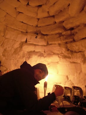 Um 20:30 Uhr hatten wir es dann geschafft. Der Letzte Block wurde eingesetzt und die Iglubeleuchtung (Fackeln) wurden eingeschaltet. Noch die Löcher abdichten und den Eingang verschliessen und endlich gab's das verdiente Einweihungsbier.