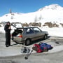 Frühmorgens fuhren wir los, verluden in Kandersteg auf die Schiene und schon bald kamen wir im sonnigen, grünen Wallis raus. Vom Schnee jedoch keine Spur. Mit gemischten Gefühlen fuhren wir die Simplonpassstrasse rauf.... Auf 1200 Meter endlich der erste Schnee. Langsam bildeten sich links und rechts entlang der Strasse die ersten Schneemauern. Auf der Simplonpasshöhe in 2000 Metern die ersten Schneetests: Ja, es hat genügend Schnee liegend und er ist brauchbar.