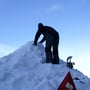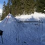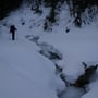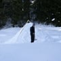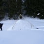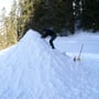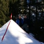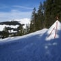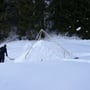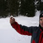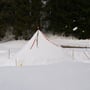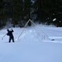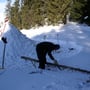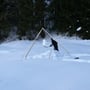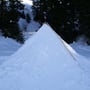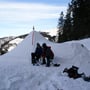 Mein Opel Corsa mit umgeklappten Hintersitzen war bis oben mit PYLOO-Material gefüllt. Schlitten, Schneeschuhausrüstung, Baugerüst und Verpflegung für zwei volle Tage. Um 09:00 Uhr erreichten wir den Jaunpass, der Ausgangsort unserer Tour. Es wurde gerade hell am Horizont und es war saukalt. Die erste Schneeprobe war ernüchternd... Ideale Qualität zum Tiefschneeskifahren - für den PYLOO-Bau sichtlich ungeeignet. Doch so schnell würden wir nicht aufgeben. Unsere Hoffnung bestand darin, dass sich der Schnee durch Pressung und Abkühlung schon härten würde, doch wir waren zu der Zeit wirklich unsicher.