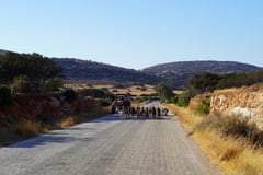 Filoti erreichten wir mit dem Auto in einer halben Stunde. Unterwegs trat die Sonne über die Berggipfel und kündigte den Tag an. Wir passierten einige Schaf- und Ziegenherden, welche von Hirten auf der Strasse nach dem Melken wieder auf Ihre Felder getrieben wurden. Auf dem Motorrad natürlich. Gehen war gestern.