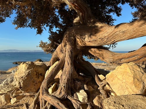 Nach dem Frühstück machten wir uns auf in das gebirgige Hinterland der Insel, welche mit einer eindrucksvollen Vielfalt daherkommt. Ein breites Gebirgsmassiv aus Granit, Gneis und Marmor, mit drei Bergen von nahezu bis zu 1'000 Metern Höhe, erhebt sich im Zentrum der Insel. Es bildet den Hintergrund für das grüne Herz, der von Olivenhainen und knorrigen Eichenbäumen bewachsenen Tragéna-Ebene. Weiter im Westen liegt fruchtbares Bauernland, das sich in einer endlosen Dünenlandschaft im Meer verläuft.