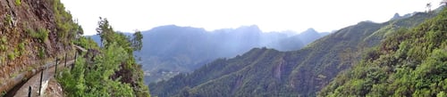 Immer tiefer stiegen wir ab. Irgendwann passierten wir die Fonte Galhano, welche uns aber nicht sonderlich auffiel. Unsicherheit kam auf, ob wir wirklich auf dem richtigen Pfad sind, denn der Weg war so gut ausgebaut, es hätte ein 4x4 Auto hinunterfahren können. Erst nach einer Stunde kam ein Hinweisschild: Ribeira da Janela - wir waren also richtig. Ab hier ging es nochmals 3km steil hinunter, zum Teil hatte das Unwetter den Weg weggerissen, doch dank unseren Trekkingstöcken kamen wir doch sicher voran. Nach 800 Höhenmetern Abstieg erreichten wir die Levada da Janela. Hier machten wir erst mal eine kurze Rast und stärkten uns.
