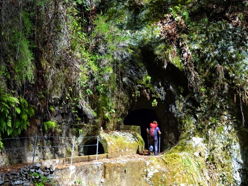 Es erreichten gerade die ersten Sonnenstrahlen meinen Weg und die Natur ringsum erschien wunderschön. Doch schon bald bog ich rechts in einen ca. 500 Meter langen Tunnel ab und widmete mich voll dem schmalen Seitenweg der Levada. Es war schon ein anderes Gefühl, komplett alleine in der Tiefe des Berges unterwegs zu sein. Doch halb so schlimm, schon konnte ich einen kleinen Lichtfleck am Ende des Tunnels erkennen.