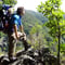 Von nun an ging es nur noch aufwärts. Zwar bot uns der Weg schöne Ausblicke, doch war es schon eine Mühe den steilen Pfad mit 20 und 18kg hochzugehen. Mit motivierenden Worten von der Emilia auf dem Rücken wie "Papa schwitz nit so, du bisch ganz nass, wäh", "ufe, ufe, loos!" oder "Papa du stinksch!" ging es weiter. Ich war mit Emilia schliesslich als erster auf dem 590m hohen Gipfel. Währenddessen war ich aber immer über das Walkie-Talkie (gleichzeitig unser Babyphone) in Verbindung mit Tanja.