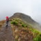 Doch es gab kein zurück, nun ging es los. Auf dem perfekt ausgebauten Wanderweg, welcher die meiste Zeit gepflastert war, schritten wir im feuchten Nebel aufwärts. Über den Bergrücken erreichten wir nach einer knappen Stunde bereits die Berghütte Pico Ruivo, welche jedoch geschlossen war. Schade, denn ein Kaffee hätte eine willkommene Pause gebracht. So entschlossen wir uns noch eine viertel Stunde weiter bis zum höchsten Punkt zu gehen (1862m).