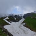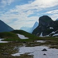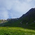 Der Anstieg brachte mich an den Anschlag meiner sportlichen Ausdauer! Ständig musste ich anhalten und um Luft ringen. Mein Rucksack fühlte sich an als ob er 25 Kilo wog, meine Beine gaben mir zu erkennen, dass sie für heute genügend Höhenmeter hinter sich gebracht hatten. Auch mein Rücken protestierte und so kam es mir vor, als ob ich Stunden in dieser Flanke verbrachte. Dies nicht genug, begann es auch noch zu gewittern und neben dem Regen konnte ich mich erneut durch rutschige Schneefelder wühlen.