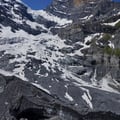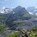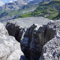 Ursprünglich wollte ich in der Gspaltenhornhütte einkehren, um meinen Wasservorrat aufzufüllen. Doch konnte ich dies auch an einem der zahlreichen Bächlein tun. Ich entschied mich also für Gletscherwasser mit Micropur und stieg sogleich hinunter zum Gletscher. Da die Moräne komplett mit Steinen und Erde überdeckt war, konnte man die Eisfelder auch ohne Sicherung alleine überqueren. Der gut ausgesteckte Wanderweg zeigte, dass er erst kürzlich revidiert wurde. Ich war also auf der sicheren Seite.