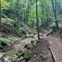 Die 600 Höhenmeter, die ich gestern raufgewackelt war, durfte ich nun heute wieder runtermarschieren. Genau genommen waren es noch ein bisschen mehr, da Budapest an der Donau am tiefsten Punk lag. Als ich mich endlich auf dem richtigen Weg befand, folgte ich dem traumhaften Wanderpfad bis Pilisszentkereszt. Der Weg verlief entlang einem Flüsschen, das sich im Verlauf der Jahrhunderte tief in die Landschaft gegraben hatte. Die Umgebung war wild und es kamen Erinnerungen an das Kaltbrunnental auf, welches auch so abgelegen, zerklüftet und märchenhaft daherkommt.