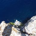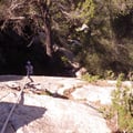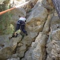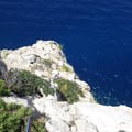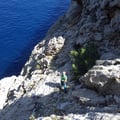 Bei der Ruine noch vor der grossen Pinie gelangten wir über einen schmalen und rutschigen Pfad hinunter zum Sektor Cazador. Darunter fanden wir den Abseilhaken, welchen wir durch eine Baumschlinge verstärkten und schliesslich weiter hinunter zum Wandfuss ca. 10 Meter über dem Wasser abseilten.