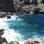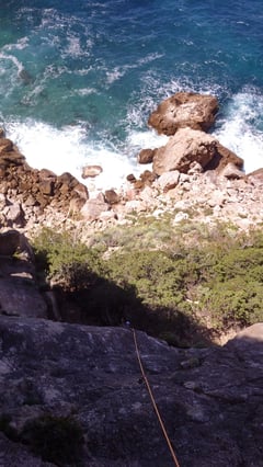 Da der "Weg" jedoch bereits vor uns lag und die Umgebung sagenhaft schön war, überlegten wir nicht lange und folgten den Anweisungen des Kletterführers. Bald kam die beschriebene "schwierigere" Stelle, welche mit drei Bohrhaken abgesichert war. Die Nutzten wir natürlich, denn unter uns toste bereits das Meer und die aufspritzenden "Zungen" des Wassers versuchten uns zu erreichen.