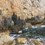 Zum Glück schaffte ich dies schliesslich. Der Stand war natürlich auch nicht zum Abseilen eingerichtet. Also opferten wir einen älteren Karabiner und eine Schlinge. Die Sicherheit ging vor. Als ich schliesslich weiter abseilte, befanden sich die Seilenden bereits unten im tosenden Meer. Kurz oberhalb des Wassers erreichte ich einen Absatz. Ich war unten. Wenig später folgte auch Tanja. Gemeinsam nahmen wir die die nass gewordenen Seile auf und kraxelten zurück zum Depot, wo sich unser Rucksack und die Schuhe befanden, bzw. noch wichtiger: Die Wasserflache und ein paar Riegel.