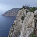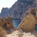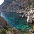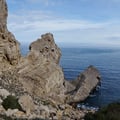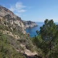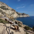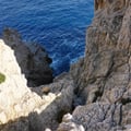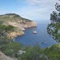 Unser heutiges Ziel war der Kletterspot in Punta de Aguila im Norden der Insel. Um dahin zu gelangen fuhren wir nach Sant Miquel de la Balansat, genauer gesagt nach Illa Blanca, von wo wir nach circa 30 Minuten Wanderung das Meer erreichten. Unser Plan war es, über die Abseilstelle zwischen den Felsvorsprüngen den Sektor Tirolina und anschliessend den Sektor Nostalgia, zu erreichen.