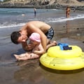 Emilia kauften wir einen Baby-Belt-Ring, damit auch sie auf das „Wellenreiten“ nicht verzichten musste. Wobei sie jedoch lieber am Strand sass und den Sand mit vollen Händen in den Mund steckte.