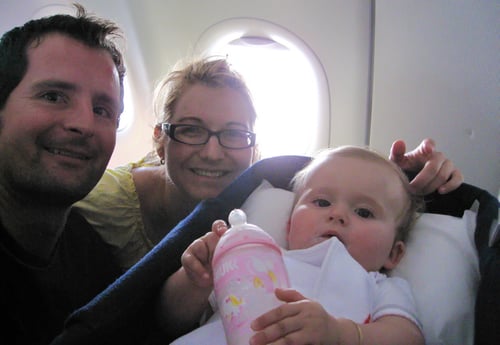 Alles lief reibungslos. Wir sassen in der ersten Reihe als die Maschine abhob. Emilia verschlief desweilen den Start. Erst über den Wolken krabbelte sie in Ihrer Schale umher und winkte den Leuten zu.