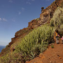 Die Etappe startete bereits spektakulär mit dem Abstieg in den riesigen Barranco de la Luz. Links und rechts des Canyons befanden sich natürliche Vulkanhöhlen, in welchem sich Ziegen, Schafe oder geschützte Lagerräume befanden. Was für ein fremdes Bild für uns. Staunend wanderten wir auf dem Pfad entlang riesiger Kakteen durch den tiefen Schlund zum anderen Ende der Schlucht.