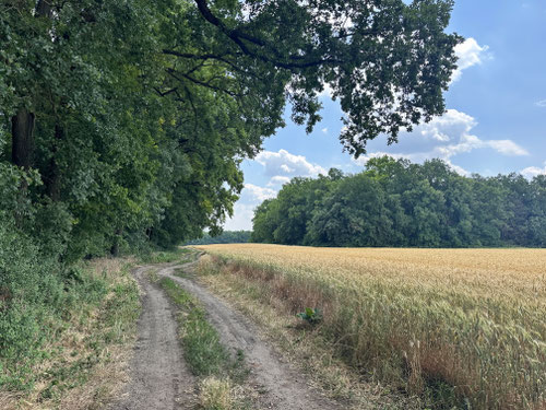 Mir fiel auf, dass viele Kornfelder noch nicht gemäht waren. Auch die Sonnenblumen auf den Feldern waren erst einen halben Meter hoch. Im Gegensatz zum letzten Jahr, wo ich um die gleiche Zeit in Ungarn war, hinkte die Natur hinterher. Dies bedeutete auch, dass ich keine Abkürzungen querfeldein durchführen konnte. Auf der letzten Wanderetappe hatte ich dies oft gemacht und einiges an Weg und somit Zeit eingespart.