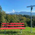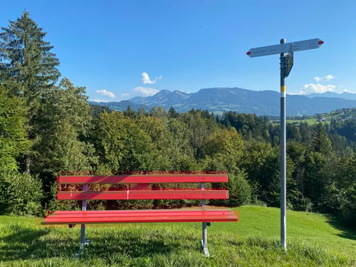 Weiter ging es der Bregenzerarch entlang bis kurz vor der Strasse zu Müselbach. Ein wenig vorher wechselte ich auf den steilen Wanderpfad nördlich hoch in die Agglomeration von Langenegg, meinem Zielort. Als ich oben aus dem wunderschönen Waldpfad heraustrat, befand ich mich ganz überraschend auf einem professionellen Fussballfeld mit Umschwung. Hier musste ich richtig sein.