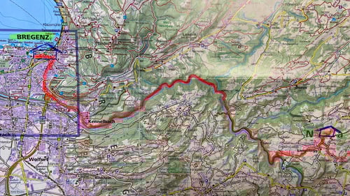 Die Wegfindung war anfangs nicht einfach. Zahlreiche verwinkelte Strassen mit kleinen Gehwegen, gekennzeichnet mit Verbots- und Privatschildern, galt es zu umgehen. Doch schliesslich traf ich auf den ausgeschilderten Wander- und Veloweg in Richtung Bregenz Weidach, dem grossen Autobahnkreuz vor dem Pfändertunnel.