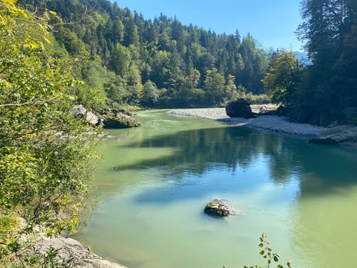 Ich vergnügte mich auf dem sehr gut ausgebauten Wanderweg. Immer wieder schweiften meine Blicke über das kühle Nass, welches in Windeseile im Flussbett neben mir vorbeischoss. Ich hingegen schwitzte in meinen schon sehr spärlichen Klamotten wie im Hochsommer.
