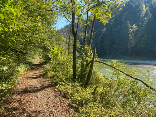 Nachdem ich das Menü "Kartoffelpuffer mit Rahmgemüse" vertilgt hatte, machte ich mich ernsthaft auf zu meiner Unternehmung. Immer der Nordseite der Bregenzerach folgend, schritt ich flott voran. Ich war entzückt, so einen tollen Weg herausgesucht zu haben. Beim Beginn des Wanderwegs stand sogar, dass der Weg nicht durchgehend bewandert werden kann, da bei einigen Tunnels Einsturzgefahr bestehe. Es gab also sogar Tunnels unterwegs; cool! Bestimmt könnten diese bei Absperrung überklettert oder über die Bregenzerach umgangen werden. Das Abenteuer schien vorprogrammiert.